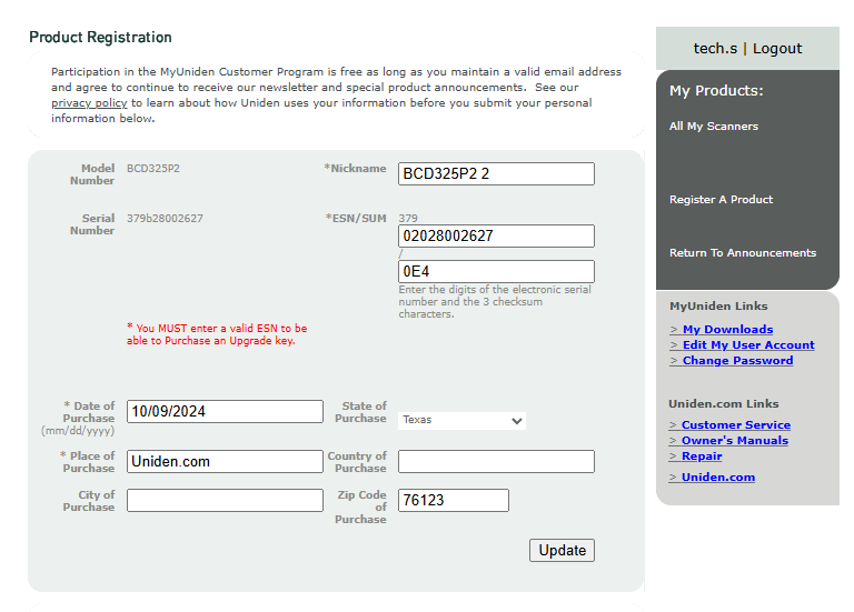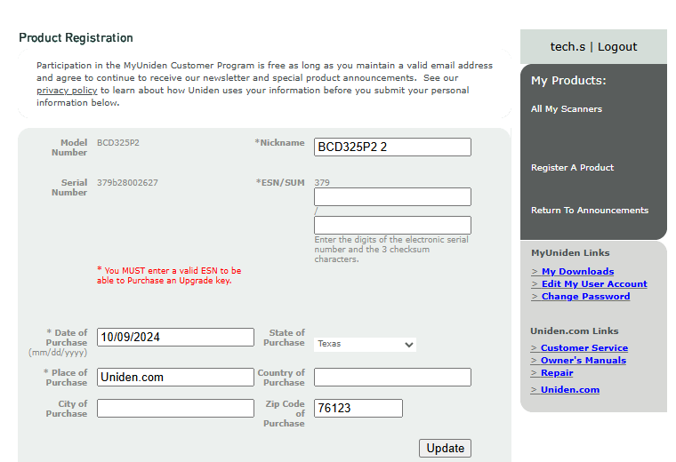 Step 7. Enter in the credentials associated with your account, and the information for the device you wish to register. If you need assistance finding the serial number, refer to you owner's manual or contact Uniden Customer Support.