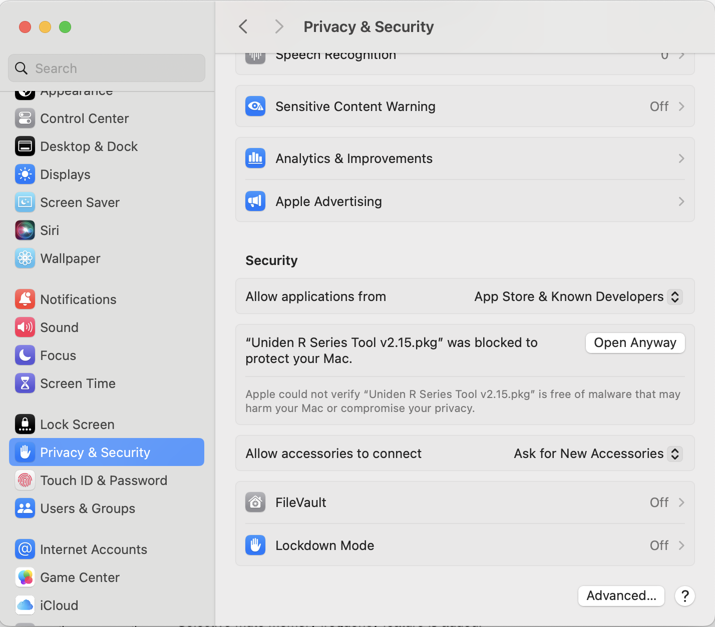 NOTE: If at this point you see a pop up stating it is malware, select "Done" and go into your Mac's settings. From here go into the device Privacy & Security page and select "Open Anyway"